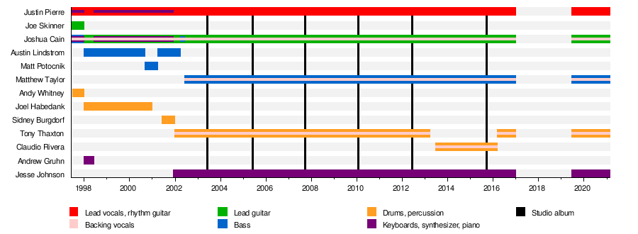 Motion City Soundtrack is an American rock band that formed in Minneapolis, Minnesota in 1997. The band's line-up consists of vocalist and guitarist Justin Pierre, lead guitarist Joshua Cain, keyboardist Jesse Johnson, bassist Matthew Taylor, and drummer Tony Thaxton. Over the course of their career, the group has toured heavily and released six studio albums, the majority on independent label Epitaph Records. The band's sound, at times described as pop punk or emo, makes notable use of the Moog synthesizer. Pierre mainly handles the band's lyrics, which often touch on themes of anxiety, alienation, and relationships.