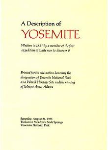- ^ A Description of Yosemite (1851). Printed for the celebration honoring the designation of Yosemite National Park as a World Heritage Site and the naming of Mount Ansel Adams, Saturday, August 24, 1985, Tuolumne Meadows, Soda Springs, Yosemite National Park. Designed and printed by Adrian Wilson at the Press in Tuscany Alley, San Francisco.