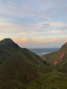 The caldera contains an active, 700-metre-tall stratovolcano rising above the surface of Lake Batur. The first documented eruption of Batur was in 1804, and it has been frequently active since then, most recently in 2000.[2][3] The substantial lava field from the 1968 eruption is visible today when viewed from Kintamani, a town on the southwest ridge of the caldera.