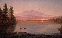The first recorded climb of "Catahrdin" was by Massachusetts surveyors Zackery Adley[13] and Charles Turner, Jr. in August 1804.[14] In the 1840s Henry David Thoreau climbed Katahdin, which he spelled "Ktaadn"; his ascent is recorded in a well-known chapter of The Maine Woods.[15] A few years later Theodore Winthrop wrote about his visit in Life in the Open Air. Painters Frederic Edwin Church and Marsden Hartley are well-known artists who created landscapes of Katahdin. On 30 November 2011, Christie's auctioned Church's 1860 painting Twilight (Katahdin) for $3.1 million.
