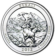On November 5, 2012, the United States Mint released a twenty-five cent piece honoring Denali National Park. It is the fifteenth of the America the Beautiful Quarters series. The reverse features a Dall sheep with Mount McKinley in the background, designed by Susan Gamble.[45] In 2012, 302 million quarters were minted.[46]