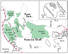 Mount Melbourne and its volcanic field are over a basement of Precambrian to Ordovician age, which consists of volcanic and metamorphic rocks of the Wilson Terrane.[47] The volcano is at the intersection of three geological structures: the Rennick Graben of Cretaceous age, the Victoria Land Basin and the Polar 3 magnetic anomaly, which has been interpreted to be either a transform fault or a push-up structure formed by faulting.[56] The Terror Rift in the Victoria Land Basin[66] runs between Mount Melbourne and Mount Erebus[59] and appears to be related to their existence.[10] The volcano appears to rise in a graben whose marginal faults are still active with earthquakes, on the eastern flank of Mount Melbourne.[67] North–south-trending faulting may also be responsible for the north–south-like trend in edifice structure,[52] and strike-slip faulting takes place on the eastern flank.[44] Recent offset on faults[68] and Holocene coastal uplift in the area indicates that tectonic activity is still ongoing.[45]