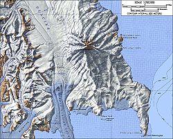 Mount Melbourne is surrounded by a volcanic field[42] consisting of 60 exposed volcanoes,[43] which have the form of scoria cones and tuff rings with hyaloclastite deposits, lava flows and pillow lavas. Some of these volcanoes formed under ice.[44] The volcanic field forms a peninsula which is separated by steep faults from the Transantarctic Mountains to the north.[23] Among these volcanoes is Shield Nunatak southwest from Mount Melbourne,[45] a subglacial volcano, now exposed, that may have formed during the latest Pleistocene.[46] The Cape Washington ridge consists mostly of lava, including pillow lava, overlaid by scoria cones,[15] and is the remnant of a shield volcano.[47] Edmonson Point is another volcanic complex in the system that formed partly while interacting with glaciers and partly through phreatomagmatic activity.[48] Other volcanoes in the field are Baker Rocks, Oscar Point and Random Hills.[49] These volcanoes are aligned mainly in north–south direction and include both edifices that formed above and under ice,[2] with palagonitized outcrops that expose dikes.[50] Perfectly preserved scoria cones occur at Pinckard Table north of the volcanic field, while Harrow Peak is a heavily eroded lava plug.[51] The total volume of volcanic rocks is about 250 cubic kilometres (60 cu mi)[23] and their emplacement apparently altered the path of the Campbell Glacier.[52]