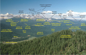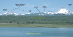 Brokeoff Volcano represents the Pleistocene component of the Lassen volcanic complex, an area of active volcanism for more than three million years. It formed during a period of eruptive activity approximately 600,000 years ago on a series of faults;[6] the largest of these eruptions was about 50 times as powerful as the 1980 eruption of Mount St. Helens. During the Pleistocene, constantly renewed lava of andesite flowed from the central vent of the volcano. The eruption of overlapping andesitic lava flows accumulated to build the volcano. By the time it reached its peak size, the volcano was immense, measuring at its base between 11 miles (18 km) and 15 miles (24 km) wide and more than 11,000 feet (3,353 m) tall.[7] Activity at Brokeoff lasted for approximately 200,000 years. Eruptions varied from ejection of pyroclastic material to andesitic lava flows built of primarily of feldspar, pyroxene, and olivine.[6]