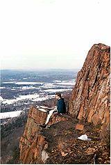 Mount Tom, 1,202 feet (366 m), is a steep, rugged traprock mountain peak on the west bank of the Connecticut River 4.5 miles (7 km) northwest of downtown Holyoke, Massachusetts. The mountain is the southernmost and highest peak of the Mount Tom Range and the highest traprock peak of the 100-mile (160 km) long Metacomet Ridge. A popular outdoor recreation resource, the mountain is known for its continuous line of cliffs and talus slopes visible from the south and west, its dramatic 1,100-foot (340 m) rise over the surrounding Connecticut River Valley, and its rare plant communities and microclimate ecosystems.[1][2]