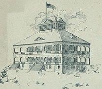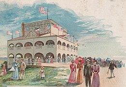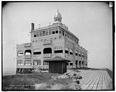 In 1897 the Holyoke Street Railway Company began constructing the Mount Tom Railroad, as well as what would become known as "Mountain Park", a trolley park and later an amusement park on the east side of the mountain. The project changed hands several times until its closure in 1988 when competition from larger amusement parks gradually sapped business away from what had become affectionately known by local residents as "The Queen of the Mountain".[4][5] The Mount Tom Summit House was also constructed on the cliffs of Mount Tom in 1897, but it burned three years later. Subsequently, rebuilt, by 1902, the property became the first parcel of the Mount Tom State Reservation, however this second house also burned in 1929, in part due to a series of failures in its water systems. The original foundation was not used again, however days later it was decided a much cheaper and smaller sheet metal structure would be built adjacent to it, housing a restaurant and souvenir stand. Because of its construction and lack of grandeur however, it remained unpopular, with one local patron, Katherine Root, remarking "the wind sounded like thunder when it roared through the building and it rattled constantly"; it was ultimately dismantled a year after the railroad, in 1939.[6] The ruins of the old summit house foundations remain prominent structures, visible on the mountainside today. In 1933 the Civilian Conservation Corps assisted with the construction of reservation structures and park roads; their work also remains visible today.