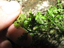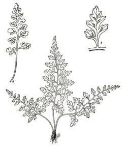 The leaf blade is thick and hairless,[4] and of a dark blue-green color;[5] the rachis (leaf axis), like the stipe, is a dull green, with occasional hairs.[4] The blade is triangular or lance-shaped, with a squared-off or slightly rounded base and a pointed tip. It ranges from 2 to 11 centimeters (0.8 to 4.3 in) long and from 1 to 7 centimeters (0.4 to 2.8 in) wide, occasionally as wide as 10 centimeters (3.9 in).[4][6] The blade varies from pinnate-pinnatifid to bipinnate-pinnatifid; that is, it is cut into lobed pinnae, and sometimes the pinnae themselves are cut into lobed pinnules. There are four to ten pairs of widely spaced pinnae per leaf, each of which is triangular to lance-shaped, with coarse incisions in the edges,[4] which cut them into pinnules or deep lobes,[2] and a rounded to angled base.[4] The pinnules are indented, but not further cut.[2] The longest pinnae are those nearest the base of the leaf, which range from 6 to 35 millimeters (0.2 to 1.4 in) long and from 4 to 20 millimeters (0.2 to 0.8 in) across. The veins in the leaf do not form a meshwork, and are obscure.[4]