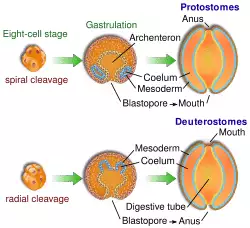 In animals at least as complex as an earthworm, the embryo forms a dent on one side, the blastopore, which deepens to become the archenteron, the first phase in the formation of the gut. In deuterostomes, the blastopore becomes the anus while the gut eventually tunnels through to make another opening, which forms the mouth. In the protostomes, it used to be thought that the blastopore formed the mouth (proto– meaning "first") while the anus formed later as an opening made by the other end of the gut. More recent research, however, shows that in protostomes the edges of the slit-like blastopore close up in the middle, leaving openings at both ends that become the mouth and anus.[5]