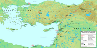 Based on the histories of al-Tabari (d. 923) and Agapius of Hierapolis (d. 941), the first raid of Mu'awiya's caliphate occurred in 662/63, during which his forces inflicted a heavy defeat on a Byzantine army with numerous patricians slain.[156] In the next year a raid led by Busr reached Constantinople and in 664/65, Abd al-Rahman ibn Khalid raided Koloneia in northeastern Anatolia.[156] In the late 660s, Mu'awiya's forces attacked Antioch of Pisidia or Antioch of Isauria.[156] According to the Muslim traditional sources, the raids peaked between 668/69 and 669/70.[156] In each of those years there occurred six ground campaigns and a major naval campaign, the first by an Egyptian and Medinese fleet and the second by an Egyptian and Syrian fleet.[159] In addition to these offensives, al-Tabari reports that Mu'awiya's son Yazid led a campaign against Constantinople in 669 and Ibn Abd al-Hakam reports that the Egyptian and Syrian navies led respectively by Uqba ibn Amir and Fadala ibn Ubayd joined the assault.[160] The modern historian Marek Jankowiak asserts that the multitude of campaigns that were reported during these two years represent coordinated efforts by Mu'awiya to conquer the Byzantine capital.[161] Dismissing the conventional view of a many years-long siege of Constantinople in the 670s, which was based on the history of the Byzantine chronicler Theophanes the Confessor (d. 818), Jankowiak asserts that Mu'awiya likely ordered the invasion during an opportunity presented by the rebellion of the Byzantine Armenian general Saborios, who formed a pact with the caliph, in spring 667.[162] The caliph dispatched an army under Fadala ibn Ubayd, but before it could be joined by the Armenians, Saborios died.[162] Mu'awiya then sent reinforcements led by Yazid who led the Arab army's invasion in the summer.[162] An Arab fleet reached the Sea of Marmara by autumn, while Yazid and Fadala, having raided Chalcedon through the winter, besieged Constantinople in spring 668, but due to famine and disease, lifted the siege in late June.[163] The Arabs continued their campaigns in Constantinople's vicinity before withdrawing to Syria most likely in late 669.[163]