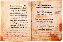 Most of the poem is in alliterative verse of very uneven quality.[4] Some lines contain rhymes, using a poetic form pioneered in the ninth century by Otfrid of Weissenburg (ca. 790–875).[5] This formal unevenness has often led scholars to regard the surviving text as a composite made up of older material and younger accretions—an impression reinforced by the poem's thematic and stylistic diversity. But it is also possible that a single poet deliberately chose to vary the verse forms in this way.[6]