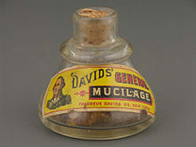 Mucilage mixed with water has been used as a glue, especially for bonding paper items such as labels, postage stamps, and envelope flaps.[7] Differing types and varying strengths of mucilage can also be used for other adhesive applications, including gluing labels to metal cans, wood to china, and leather to pasteboard.[8] During the fermentation of nattō soybeans, extracellular enzymes produced by the bacterium Bacillus natto react with soybean sugars to produce mucilage. The amount and viscosity of the mucilage are important nattō characteristics, contributing to nattō's unique taste and smell.