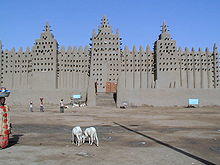 The Great Mosque of Djenné, in central Mali, is the world's largest mudbrick structure. It, like much Sahelian architecture, is built with a mudbrick called Banco,[11] a recipe of mud and grain husks, fermented, and either formed into bricks or applied on surfaces as a plaster like paste in broad strokes. This plaster must be reapplied annually.[12]