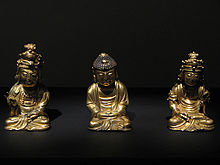 The Dhyāna mudrā ("meditation mudrā") is the gesture of meditation, of the concentration of the Good Law and the saṅgha. The two hands are placed on the lap, right hand on left with fingers fully stretched (four fingers resting on each other and the thumbs facing upwards towards one another diagonally), palms facing upwards; in this manner, the hands and fingers form the shape of a triangle, which is symbolic of the spiritual fire or the Triratna (the three jewels). This mudrā is used in representations of the Śākyamuni Buddha and Amitābha Buddha. Sometimes the Dhyāna mudrā is used in certain representations of Bhaiṣajyaguru as the Medicine Buddha, with a medicine bowl placed on the hands. It originated in India most likely in the Gandhāra and in China during the Wei period. This mudrā was used long before the Buddha as yogis have used it during their concentration, healing, and meditation exercises. It is heavily used in Southeast Asia in Theravāda Buddhism; however, the thumbs are placed against the palms. (Dhyāna mudrā is also known as Samādhi mudrā or Yoga mudrā; Japanese: Jō-in, Jōkai Jō-in; Chinese: Ding Yin.)