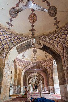 The Wazir Khan Mosque was commissioned during the reign of the Mughal Emperor Shah Jahan in 1634, and completed in 1642.[10] Considered to be the most ornately decorated Mughal-era mosque,[11] Wazir Khan Mosque is renowned for its intricate faience tile work known as kashi-kari, as well as its interior surfaces that are almost entirely embellished with elaborate Mughal-era frescoes. The mosque has been under extensive restoration since 2009 under the direction of the Aga Khan Trust for Culture and the Government of Punjab.[12]