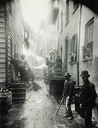 For the urban reformer Jacob Riis, Mulberry Bend epitomized the worst of the city's slums: "A Mulberry Bend Alley" contrasted with "Mulberry Bend becomes a park" were two of the photographs illustrating Jacob Riis's call for renewal, The Battle with the Slum (1902).[7] In response to reformers such as Riis, the city in the 1890s bought out many of the slumlords and replaced tenements with Columbus Park.[8]