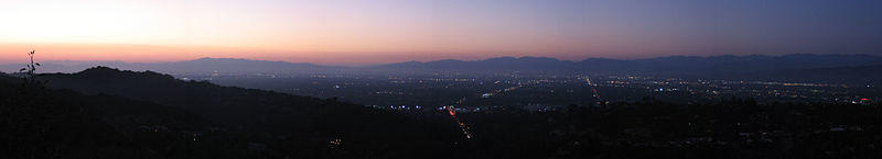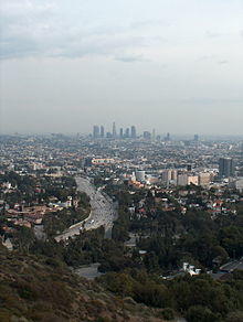 The eastern terminus of Mulholland Drive is at its intersection with Cahuenga Boulevard[1] at the Cahuenga Pass over the Santa Monica Mountains (at this point Cahuenga Boulevard runs parallel to Highway 101/The Hollywood Freeway). The road continues to the west, offering vistas of the Hollywood Sign, Downtown Los Angeles, and then Burbank, Universal City, and the rest of the San Fernando Valley with the San Gabriel, Verdugo, and Santa Susana Mountains.