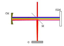 The expanded laser beam reaches the Diffractive grating (G) first, the first-order reflection is deflected to the Mirror (M) and then to the curved mirror (CM). The curved mirror reflects the laser to the spatial light modulator (SLM). The phases are applied through the SLM to each component of the frequency. The laser is then retro-reflected. By using a nonlinear medium, the nonlinear (SHG, THG, etc.) spectra vs. the phase scan can be recorded as a MIIPS trace for the characterization of the pulse. Once the pulse is characterized, a compensatory phase can be applied to the ultrashort pulse through the SLM.