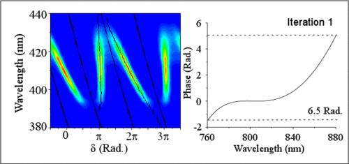 The frequency doubled spectrum recorded for each full scan of the reference phase results in two replicas of the MIIPS trace (see Figure 1, four replicas shown). From this data, a 2D plot for SHG() is constructed where . The second harmonic spectrum of the resulting pulse has a maximum amplitude at the frequency where the second derivative of the pulse has been compensated. The lines describing are used to obtain analytically the second derivative of the unknown phase. After double integration the phase distortions are known. The system then introduces a correction phase to cancel the distortions and achieve shorter pulses. The absolute accuracy of MIIPS improves as the phase distortions diminish, therefore an iterative procedure of measurement and compensation is applied to reduce phase distortions below 0.1 radian for all frequencies within the bandwidth of the laser.