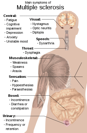 Multiple sclerosis (MS), also known as encephalomyelitis disseminata, is a demyelinating disease in which the insulating covers of nerve cells in the brain and spinal cord are damaged.[1] This damage disrupts the ability of parts of the nervous system to transmit signals, resulting in a range of signs and symptoms, including physical, mental, and sometimes psychiatric problems.[5][8][9] Specific symptoms can include double vision, blindness in one eye, muscle weakness and trouble with sensation or coordination.[1][10][11] MS takes several forms, with new symptoms either occurring in isolated attacks (relapsing forms) or building up over time (progressive forms).[12][13] Between attacks, symptoms may disappear completely; however, permanent neurological problems often remain, especially as the disease advances.[13]