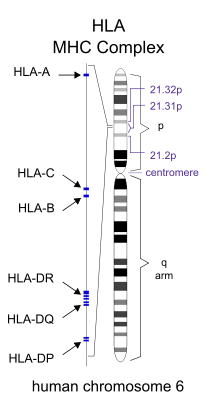 Specific genes that have been linked with MS include differences in the human leukocyte antigen (HLA) system—a group of genes on chromosome 6 that serves as the major histocompatibility complex (MHC).[5] That differences in the HLA region are related to susceptibility has been known since the 1980s,[42] and this same region has also been implicated in the development of other autoimmune diseases such as diabetes type I and systemic lupus erythematosus.[42] The most consistent finding is the association between multiple sclerosis and alleles of the MHC defined as DR15 and DQ6.[5] Other loci have shown a protective effect, such as HLA-C554 and HLA-DRB1*11.[5] Overall, it has been estimated that HLA differences account for between 20% and 60% of the genetic predisposition.[42] Modern genetic methods (genome-wide association studies) have revealed at least twelve other genes outside the HLA locus that modestly increase the probability of MS.[42]