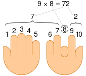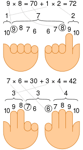 Multiplying two whole numbers, each from 6 to 10 can be achieved using fingers and thumbs as follows:
