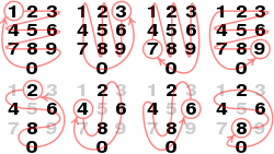 Figure 1 is used for multiples of 1, 3, 7, and 9. Figure 2 is used for the multiples of 2, 4, 6, and 8. These patterns can be used to memorize the multiples of any number from 0 to 10, except 5. As you would start on the number you are multiplying, when you multiply by 0, you stay on 0 (0 is external and so the arrows have no effect on 0, otherwise 0 is used as a link to create a perpetual cycle). The pattern also works with multiples of 10, by starting at 1 and simply adding 0, giving you 10, then just apply every number in the pattern to the "tens" unit as you would normally do as usual to the "ones" unit.