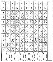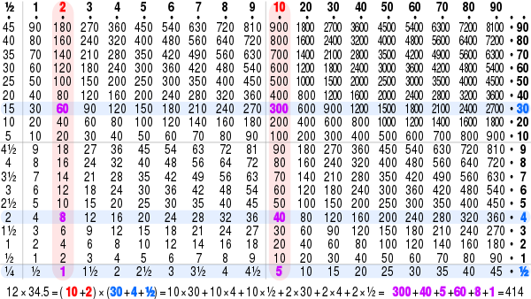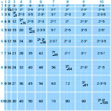 In his 1820 book The Philosophy of Arithmetic,[7] mathematician John Leslie published a multiplication table up to 99 × 99, which allows numbers to be multiplied in pairs of digits at a time. Leslie also recommended that young pupils memorize the multiplication table up to 50 × 50. The illustration below shows a table up to 12 × 12, which is a size commonly used in schools.