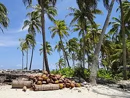 - Coconut palm (Cocos nucifera) – used for food, purified water (juice from inside the coconut), roof thatching, firewood, shade.