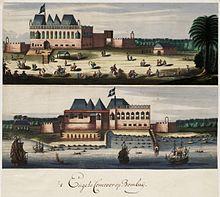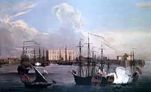 In accordance with the Royal Charter of 27 March 1668, England leased these islands to the English East India Company in 1668 for a sum of £10 per annum.[100] The population quickly rose from 10,000 in 1661, to 60,000 in 1675.[101] The islands were subsequently attacked by Yakut Khan, the Muslim Koli[102][103][104][105] admiral of the Mughal Empire, in October 1672,[106] Rickloffe van Goen, the Governor-General of Dutch India on 20 February 1673,[107] and Siddi admiral Sambal on 10 October 1673.[106]