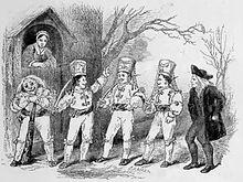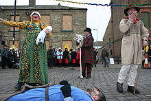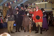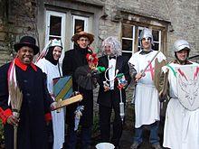 Mummers and "guisers" (performers in disguise) can be traced back at least to 1296, when the festivities for the marriage of Edward I's daughter at Christmas included "mummers of the court" along with "fiddlers and minstrels".[8] These "revels" and "guisings" may have been an early form of masque and the early use of the term "mumming" appears to refer specifically to a performance of dicing with the host for costly jewels, after which the mummers would join the guests for dancing, an event recorded in 1377 when 130 men on horseback went "mumming" to the Prince of Wales, later Richard II.[9][10]