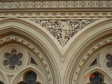 The building is known for its 255 ft (77.7 m) tall tower. The chief architectural feature is the central dome that rises to a height of 71.5 m (234.6 ft).[1] The gable has a huge winged allegorical figure representing the 'urbs prima in Indis', the first city of India as it was to be known then. The richly molded and paneled Council Chamber has a ceiling of unpolished teak. Records also support that at these environs Phansi Talao or Gallows Tank, where public hangings took place, was located.[7][10][11] In the period from 1100 to 1500 AD, the architecture of churches constructed with ornamental arches, with ribs supported by buttresses resulted, in the subsequent idea of the framed structural design with grandeur and monumentality during the renaissance period of 1500–1700 AD, as the distinct style; the Mumbai Municipal Corporation building, Chhatrapati Shivaji Maharaj Terminus, the Rajabai tower and the University of Mumbai are some examples of this style. The old style of dome construction was also revived and became popular; 1750 onwards was considered to be the period of modern architecture.[12] The Gothic architecture with controlled composition custom–made to the climatic extremes of the city has cusped window arches and elaborately domed corner towers.[13]