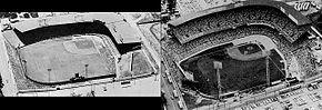 Muehlebach had anticipated that Kansas City would eventually get a major league team. Accordingly, when the stadium was initially built, it was designed with footings that were theoretically strong enough to support a future second deck. However, when work began on double-decking the stadium, it was discovered that after three decades, the footings were no longer strong enough to support the weight of a second deck. City officials elected to almost completely demolish the stadium and rebuild from scratch. The city ran three shifts and the new stadium was built in 90 days, completed in time for the April, 1955 opening. The new construction was financed by a bond issuance. The expanded stadium was supposed to seat 38,000, but cost overruns as a result of overtime payments forced officials to reduce capacity to just over 30,000.[6] The Braves Field scoreboard in Boston was purchased for $100,000 and moved from Boston to Kansas City, while temporary bleachers were added in the left field corner and parts of the outfield.[7] This was quite an accomplishment, considering that the city of Seattle would try to upgrade Sick's Stadium in a similar fashion in 1969, but failed.