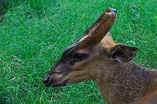 Muntjacs (/mʌntæk/ MUNT-jak),[1] also known as barking deer or rib-faced deer are small deer of the genus Muntiacus native to south and southeast Asia. Muntjacs are thought to have begun appearing 15–35 million years ago, with remains found in Miocene deposits in France, Germany[2] and Poland.[3] Most species are listed as Least Concern or Data Deficient by the IUCN although others such as the black muntjac, Bornean yellow muntjac and giant muntjac are Vulnerable, Near Threatened and Critically Endangered respectively.[4][5]
