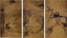 Muqi's triptych of Guanyin, Crane, and Gibbons at Daitokuji in Kyoto, Japan, is considered as one of Muqi's iconic works. The white-robed Guanyin was depicted from a three-quarter perspective as the centerpiece of the triptych. Sitting against a cliff with hands and legs covered by loosely folded draperies of the robe, Guanyin is wearing lavishly decorated head-wear and jewelry to show his status as a Bodhisattva. The willow tree twig is placed on his left side. The image of Muqi's "white-robed Guanyin" has also conveyed a unique situation when Guanyin was sitting by the water under the moon. Muqi's signature "respectfully made by the monk Fachang of Shu [Sichuan]" was signed on the lower left corner of the painting along with the seal of "Muqi". The crane is portrayed in the left painting of the triptych with its body leaning forward to the right. It is galloping loudly with its head lifted, neck stretched, and beaks widely open.[11] On the other side of the Guanyin painting rests the Gibbons painting. A mother gibbon is sitting on a withered tree branch, holding a baby gibbon in her right arm while grasping the tree branch with her left.[12]