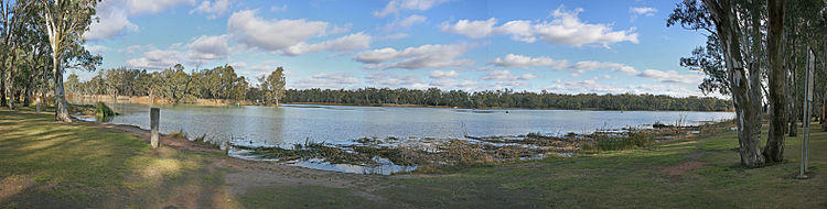 The Murray River makes up most of the border between the Australian states of Victoria and New South Wales. Where it does, the border is the top of the bank of the Victorian side of the river (i.e., none of the river itself is actually in Victoria).[5] This was determined in a 1980 ruling by the High Court of Australia, which settled the question as to which state had jurisdiction in the unlawful death of a man who was fishing by the river's edge on the Victorian side of the river.[6] This boundary definition can be ambiguous, since the river changes its course over time, and some of the river banks have been modified.