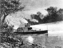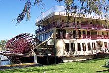 The lack of an estuary means that shipping cannot enter the Murray from the sea. However, in the 19th century the river supported a substantial commercial trade using shallow-draft paddle steamers, the first trips being made by two boats from South Australia on the spring flood of 1853. The Lady Augusta, captained by Francis Cadell, reached Swan Hill while another, Mary Ann, captained by William Randell, made it as far as Moama (near Echuca).[14] In 1855 a steamer carrying gold-mining supplies reached Albury but Echuca was the usual turn-around point, though small boats continued to link with up-river ports such as Tocumwal, Wahgunya and Albury.[15]