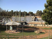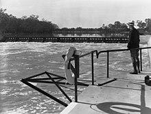 Lock 1 was completed near Blanchetown in 1922. Torrumbarry weir downstream of Echuca began operating in December 1923. Of the numerous locks that were proposed, only thirteen were completed; Locks 1 to 11 on the stretch downstream of Mildura, Lock 15 at Euston and Lock 26 at Torrumbarry. Construction of the remaining weirs purely for navigation purposes was abandoned in 1934. The last lock to be completed was Lock 15, in 1937.[18] Lock 11, just downstream of Mildura, creates a 100-kilometre (62 mi) long lock pool which aided irrigation pumping from Mildura and Red Cliffs.
