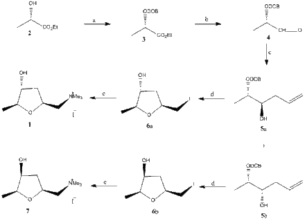 The scheme below represents a very efficient way of the synthesis of (+)-muscarine according to the scientists Chan and Li in the Canadian journal of Chemistry in 1992.[7] S-(−)-Ethyl lactate (2)(Figure 4) is converted into the 2,6-dichlorobenzyl ether (3). Diisobutylaluminium hydride (DIBAL) reduction of the 2,6-dichlorobenzyl ether gives the aldehyde (4). Treatment of the crude aldehyde with allyl bromide and zinc powder in water with NH4Cl as catalyst resulted in an anti:syn mixture of 5a and 5b. Treatment of 5a with iodine in CH3CN at 0 °C gives the cyclized product 6a. Finally treatment of 6a with excess trimethylamine in ethanol gave (+)-muscarine (2S,4R,5S). A similar reaction sequence with 5b gave (+)-epimuscarine (7).[7]