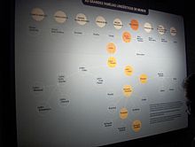 On a large panel, the remote Indo-European origins of languages are shown. The history and evolution of Portuguese is traced from Archaic Latin through Classical Latin, Vulgar Latin and old Romance languages to the three elements that make up the heart of contemporary Portuguese: Lusitanian Portuguese, languages indigenous to Brazil and African languages. The panel covers six thousand years of human history and is the product of research by professor Ataliba de Castilho.