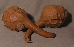 The mbira is an integral part of Zimbabwean music.[2][3] Classified by musicologists as a lamellaphone, part of the plucked idiophone family, it is created from things found in nature such as a wooden board (often fitted with a resonator) and tines. It is frequently played in a deze (calabash resonator) which amplifies the sound and augments using shells or bottle caps placed around the edges. Often accompanied by the hosho, a percussion instrument, the mbira is often an important instrument that people play at religious ceremonies, weddings, and other social gatherings. The mbira plays a central role in the traditional Bira ceremony used to call on ancestral spirits.[3]