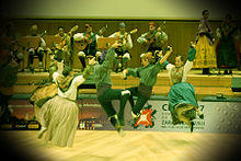 Asturias is also home to popular musicians such as José Ángel Hevia (bagpiper) and the group Llan de cubel. Circular dances using a 6/8 tambourine rhythm are a hallmark of this area. Vocal asturianadas show melismatic ornamentations similar to those of other parts of the Iberian Peninsula. There are many festivals, such as "Folixa na Primavera" (April, in Mieres), "Intercelticu d'Avilés" (Interceltic festival of Avilés, in July), as well as many "Celtic nights" in Asturias.