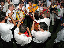 Jota is popular, but is uniquely slow in Castile and León, unlike its more energetic Aragonese version. Instrumentation also varies much from the one in Aragon. Northern León, that shares a language relationship with a region in northern Portugal and the Spanish regions of Asturias and Galicia, also shares their musical influences. Here, the gaita (bagpipe) and tabor pipe playing traditions are prominent. In most of Castile, there is a strong tradition of dance music for dulzaina (shawm) and rondalla groups. Popular rhythms include 5/8 charrada and circle dances, jota and habas verdes. As in many other parts of the Iberian peninsula, ritual dances include paloteos (stick dances). Salamanca is known as the home of tuna, a serenade played with guitars and tambourines, mostly by students dressed in medieval clothing. Madrid is known for its chotis music, a local variation to the 19th-century schottische dance. Flamenco, although not considered native, is popular among some urbanites but is mainly confined to Madrid.