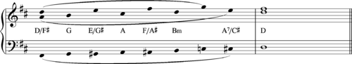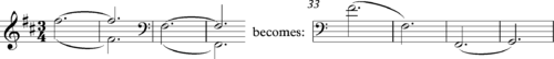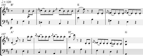 The Scherzo movement from Beethoven's Piano Sonata No. 15 in D major, Op 28 (the "Pastoral" Sonata) shows a number of these processes at work on a small scale. Charles Rosen (2002) marvels at the simplicity of the musical material: "The opening theme consists of nothing but four F sharps in descending octaves, followed by a light and simple I/ii/V7/I cadence with a quirky motif repeated four times."[4] These opening eight bars provide all the material Beethoven needs to furnish his development, which takes place in bars 33-48: