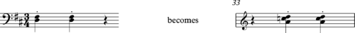 The somewhat bald falling octave idea in the first four bars is transformed in bars 33-36 into an elegant shape ending with an upward-curving semitone: