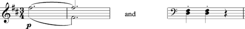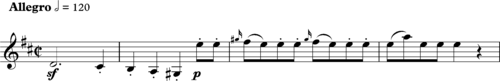 Not all development takes place in what is commonly known as the "development section" of a work. It can take place at any point in the musical argument. For instance, the “immensely energetic sonata movement”[6] that forms the main body of the overture to Mozart’s Opera Don Giovanni announces the following theme during the initial exposition. It consists of two contrasting phrases: “first determined, then soft and conspiratorial.”[7]