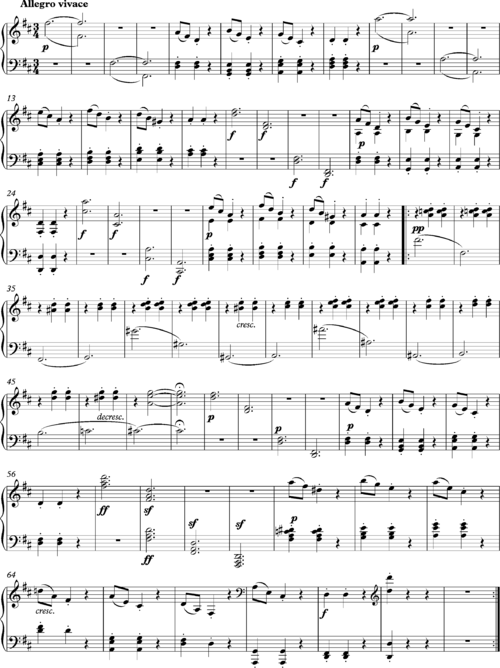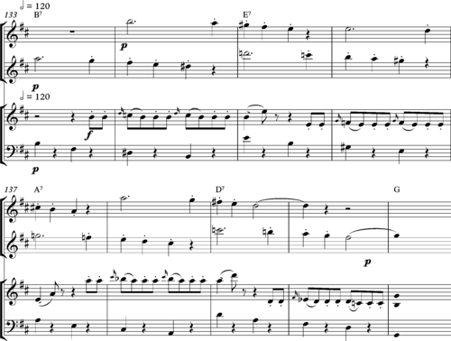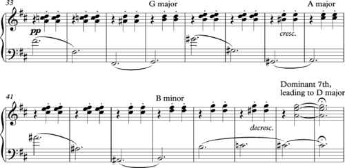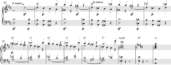 William Mann says “the first, insistent phrase [of the above] is very important. At once it is taken up imitatively by various departments of the orchestra, and [starting in] A major, jumps through several related keys.”[8] Each repetition of the descending phrase is subtly altered one note at a time, causing the music to pass from the key of A major, through A minor and thence via a chord of G7 to the remote key of C major, and thence back to A major.
