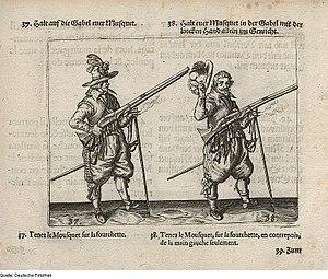 Frederick Lewis Taylor claims that a kneeling volley fire may have been employed by Prospero Colonna's arquebusiers as early as the Battle of Bicocca (1522).[54] However this has been called into question by Tonio Andrade who believes this is an over interpretation as well as mis-citation of a passage by Charles Oman suggesting that the Spanish arquebusiers kneeled to reload, when in fact Oman never made such a claim.[55] European gunners might have implemented the volley fire to some extent since at least 1579 when the Englishman Thomas Digges suggested that musketeers should, "after the old Romane manner make three or four several fronts, with convenient spaces for the first to retire and unite himselfe with the second, and both these if occasion so require, with the third; the shot [musketeers] having their convenient lanes continually during the fight to discharge their peces."[56] The Spanish too displayed some awareness of the volley technique. Martín de Eguiluz described it in the military manual, Milicia, Discurso y Regla Militar, dating to 1586: "Start with three files of five soldiers each, separated one from the other by fifteen paces, and they should comport themselves not with fury but with calm skillfulness [con reposo diestramente] such that when the first file has finished shooting they make space for the next (which is coming up to shoot) without turning face, countermarching [contrapassando] to the left but showing the enemy only the side of their bodies, which is the narrowest of the body, and [taking their place at the rear] about one to three steps behind, with five or six pellets in their mouths, and two lighted matchlock fuses … and they load [their pieces] promptly … and return to shoot when it's their turn again."[57] Most historians, including Geoffrey Parker, have ignored Eguiluz, and have erroneously attributed the invention of the countermarch to Maurice of Nassau, although the publication of the Milicia, Discurso y Regla Militar antedates Maurice's first letter on the subject by two years.[58] Regardless, it is clear that the concept of volley fire had existed in Europe for quite some time during the 16th century, but it was in the Netherlands during the 1590s that the musketry volley really took off. The key to this development was William Louis, Count of Nassau-Dillenburg who in 1594 described the technique in a letter to his cousin: