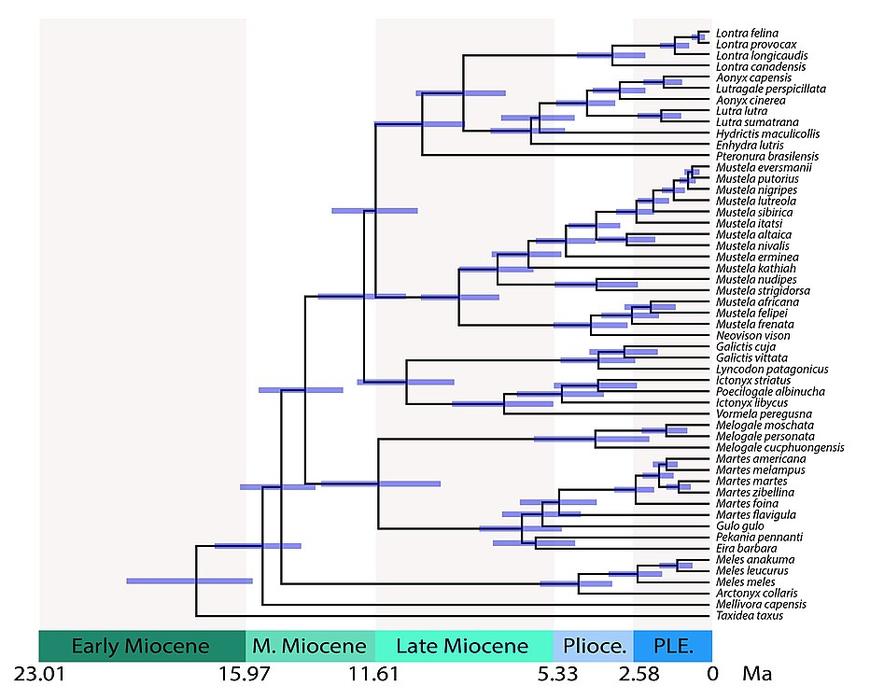 - ^ a b c d e f g Law, C. J.; Slater, G. J.; Mehta, R. S. (2018-01-01). "Lineage Diversity and Size Disparity in Musteloidea: Testing Patterns of Adaptive Radiation Using Molecular and Fossil-Based Methods". Systematic Biology. 67 (1): 127–144. doi:10.1093/sysbio/syx047. PMID 28472434.