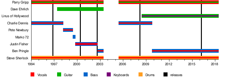 Nerf Herder was formed in Santa Barbara in 1994 by Parry Gripp (vocals, guitar), Charlie Dennis (bass), and Steve Sherlock (drums). Dennis left the band after the release of their debut self-titled album, and was replaced first by Pete Newbury, with Dave Ehrlich also joining as a second guitarist.[6] Newbury's tenure touring with the band was, however, short-lived. He was briefly replaced in 1999 by bassist Marko 72,[7] and then by Justin Fisher,[6] who played bass and keyboards on two albums (How To Meet Girls & American Cheese).