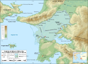 During this rise to prominence twelve cities were settled or resettled and emerged as Ionia speaking varieties of Ionic Greek. Vitruvius, however, says there were thirteen, the extra state being Melite, which "... as a punishment of the arrogance of its citizens was detached from the other states in a war levied pursuant to the directions of a general council (communi consilio); and in its place ... the city of Smyrna was admitted into the number of Ionian states (inter Ionas est recepta)."[6] There is no other mention of Melite anywhere but two fragments of Hecataeus say that Melia was a city of Caria and an inscription from Priene confirms that there had been a "Meliac War"[7] against a state located between Priene and Samos; i.e., on Mycale.
